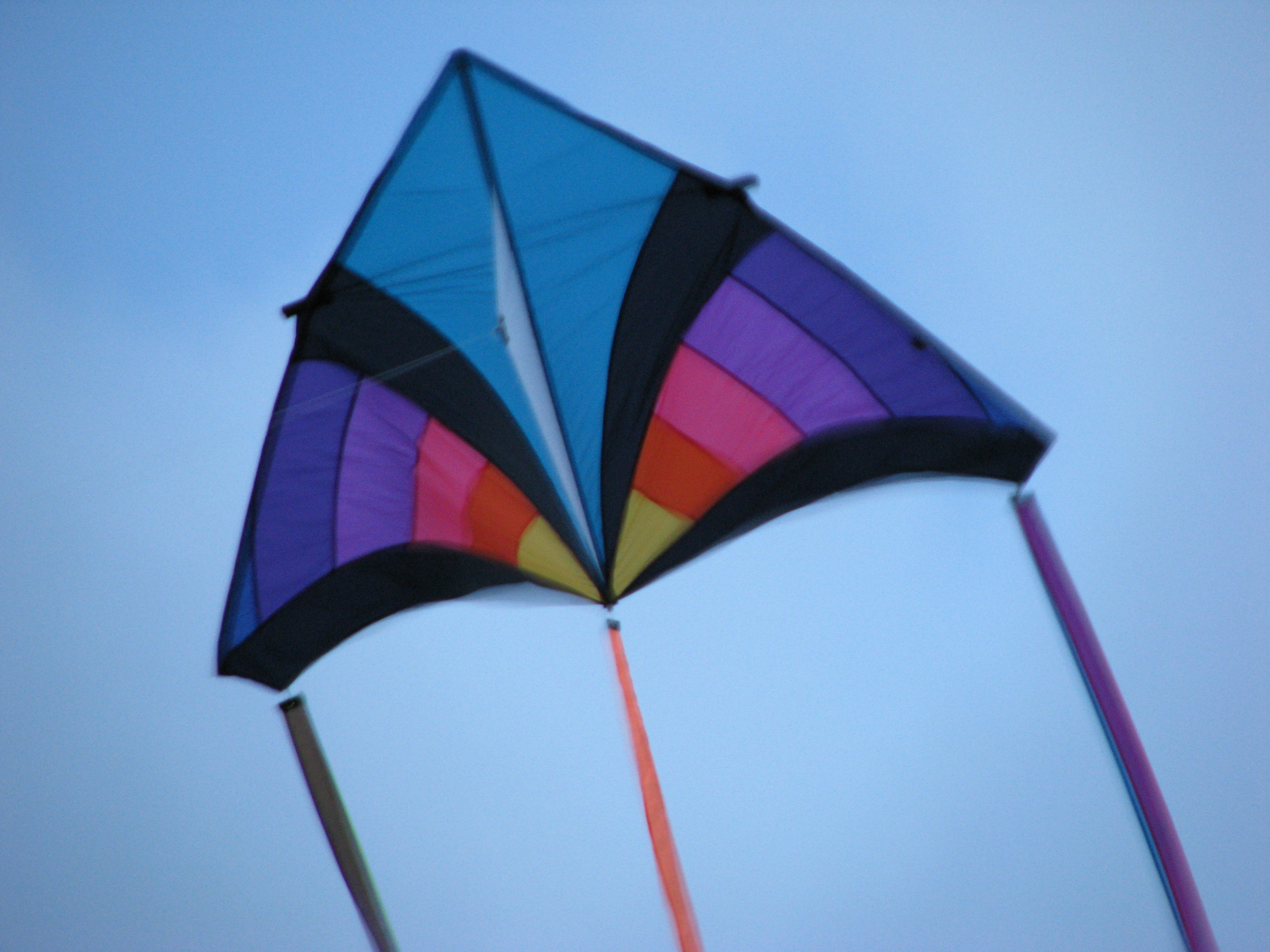 John dug out his first kite, a rainbow delta with ribbon tails. He hadn’t flown it for a couple of years. It was ready to go as soon as it came out of the bag and flew like a champ. He also put up his New Tech Paper Airplane kite and his Prism EO 6. He put transition tails on the Paper Airplane and, I believe, it flew better than it had before. By the way, EO stands for “expandable object”. Both the Atom and the EO 6 fold flat when not flying. Pretty nifty little kites. All of these kites just hung in the sky. Well almost all, the Atom kept coming down as the wind picked up a little. There’s always one problem child in the bunch.