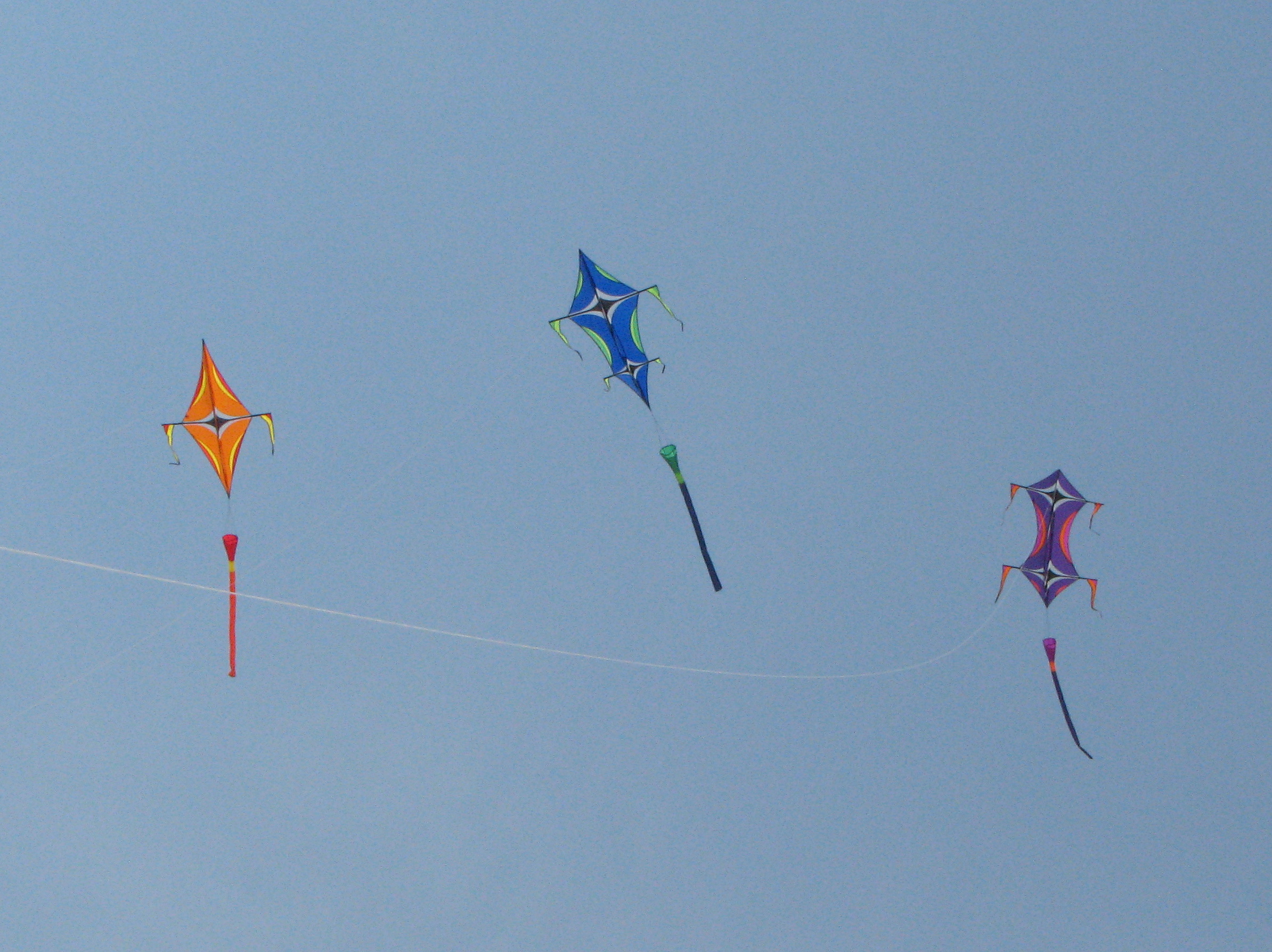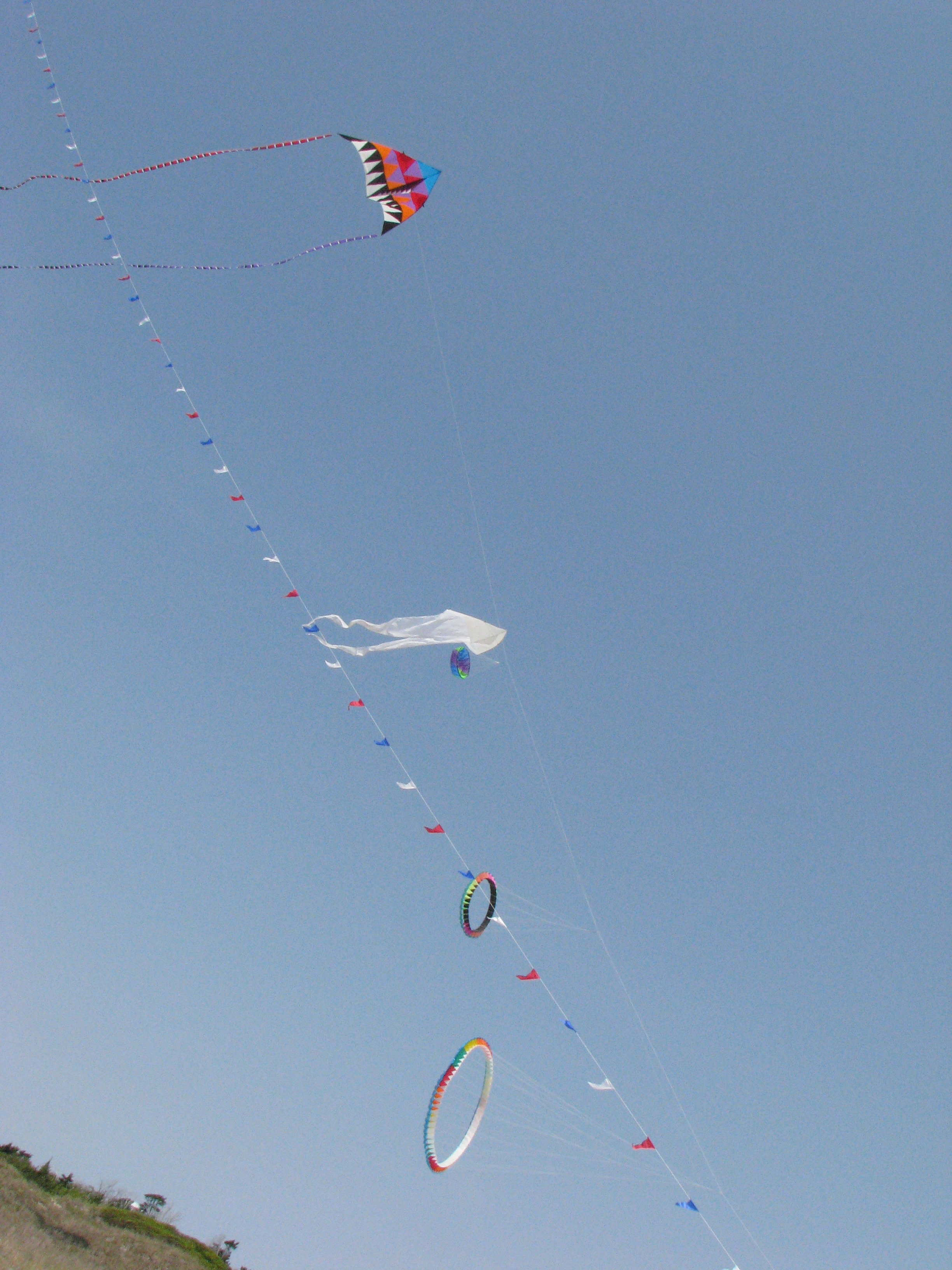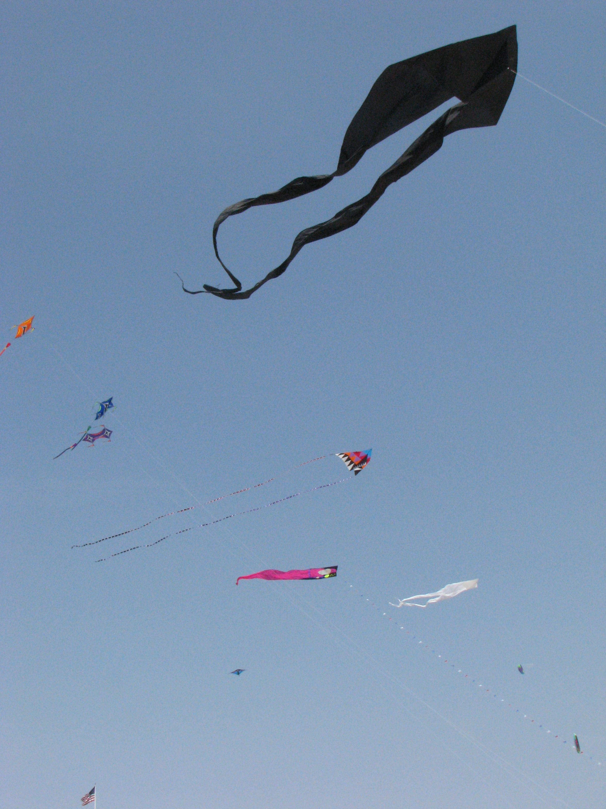 This morning was the weekly club fly. Again it was a gorgeous day. The wind was twelve to fourteen. And there were several people out to fly. Regulars and new-comers. We filled the sky and had dual liners and Rev fliers performing. There were large deltas up with long tails and a sled with matching pennant tail by Gomberg Kites. Both of these carried lots of line laundry. A couple of ghost deltas and Merlin the Wizard dragon, which flew better upside down, were also in the air. Add to that my three Xelons and some miscellaneous sleds and deltas and there was quite a show today. We don’t understand the Wizard kite. It would fly for a while normally and then, for no apparent reason, it would flip over and fly with the bridle on top and the spars down. Most unusual.
