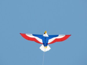 The predominate kite was the box delta. Usually with tails or streamers. There was a regular delta, a parafoil, a diamond and a faceted star in the colors the day. Because of the lighter winds, there were also a collection of Wala XLs. They really look good in the sky. Especially when you have a group of them flying together. The best kite of the day, in my humble opinion, was the red-white-blue eagle. I’m not afraid to brag. I managed to get an original Sky Delight eagle kite. Signed and dated by Joel Scholz, I have been saving it just for the Maritime Day fly. It went up right away and hung in the sky the whole time. Well, maybe not the whole time. It did have a couple of altercations with the Uncle Sam della porta but they worked things out and both flew peacefully afterwards.