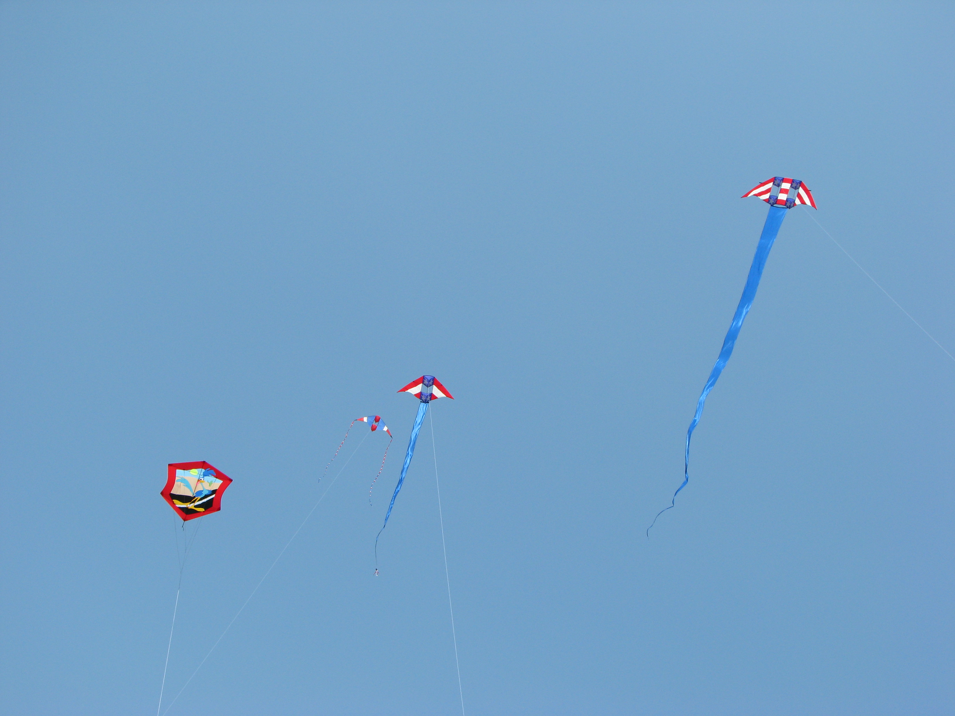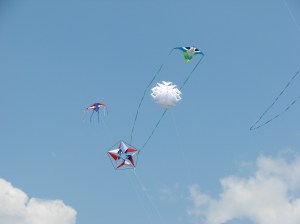 Monday was a most spectacular day. The local maritime museum holds Maritime Day on their grounds by the water. Maritime Day is a day to get the public out to see what the museum is all about. They have live music, activities for the kids and the kid in all of us, boat rides and free food. They encourage the public to come out and have a good time. It is really fun. When else would you get a chance to ride in a breeches buoy? Personally, I’d rather ride one here than when my life depended on it at sea. Or make a fish print on a T-shirt? In the midst of all this, the kite club puts as much color in the sky as is possible in a small area. Or rather as much red-white-blue in the sky. Because it is Memorial Day, we try to all fly red-white-blue kites. Of course, other kites are welcome. The only request is that we leave the stunt kites home as there is not much space to accommodate them. Most of our out-of-town kite fliers were there. That made it a fun day. Plenty of chatting as well as flying. The winds started out light in the morning and picked up as the day went along.