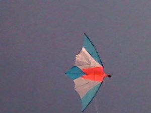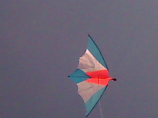 Sunday there was absolutely no wind. I mean NO WIND. I got to the beach late and there were only a couple of people there. The main activity was standing around talking. There were several Walas and a Laima (both low wind kites) laying on the ground. Even the Breeze by HQ would not fly. And that is a pretty reliable dual-line low wind kite. I only took one kite out of the car to take with me. It was the Chiroptera, my newest kite, labeled an indoor and ultra-low wind kite. I started flying it on a short line with a wand. I actually got some nice glides and a couple of swooping turns. The wind picked up to about 1 mph and I put it on a spool of line and it flew wonderfully overhead. When the wind let up, it just hovered and drifted and waited for another breath of wind to climb again. The only kite that would fly that day. Because I came by myself, I did not bring a camera with me. So the only photo I have of the maiden flight of the Chiroptera was taken with a cell phone camera. Not the best but it will do in a pinch. Thank you Will Sturdy for building a great kite. Thank you Barry for the photos.