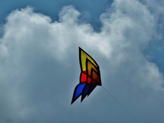Sunday was the weekly club fly. We have been seeing strong winds most of the week. The forecast for Sunday was for winds to moderate and be at an ideal level for flying. Weatherman, can you ever get anything right? It was howling a gale out on the beach. There were a lot of people out that morning. And there were quite a few kites in the air. Most notably, a large Sutton with a banner tail and lots of line laundry hanging from it and a HQ Triangulation, also with line laundry. Most of us foolishly listened to the weatherman and only brought mid-range kites and didn’t want to risk damage in the higher winds. So we stood around a lot and talked a lot.