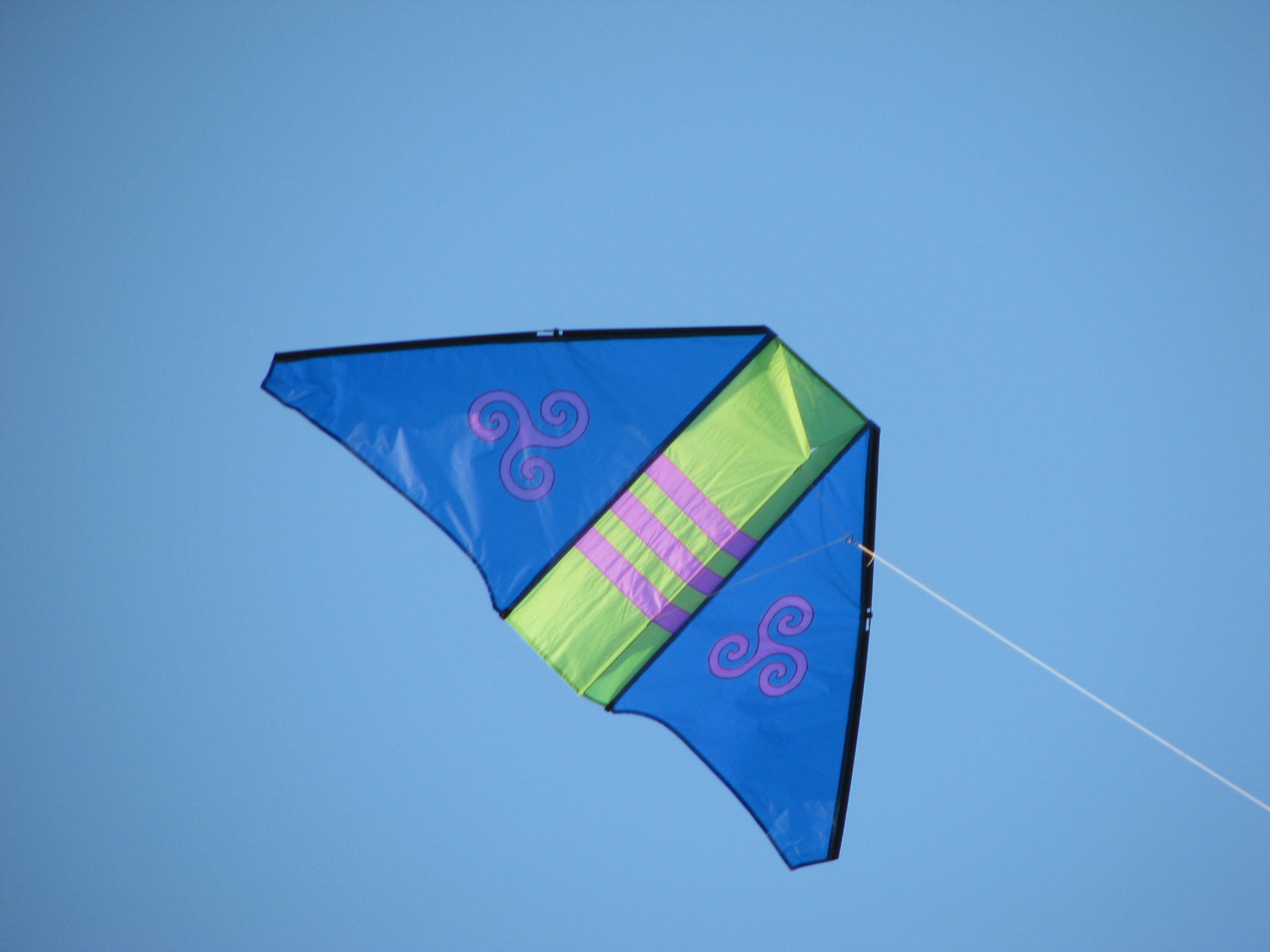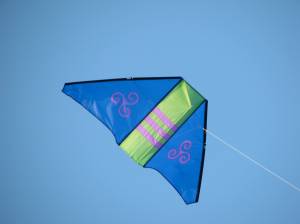 We finally got to fly for about an hour each on the following Tuesday and Thursday evenings. The first evening I flew the Dunston-Taylor box delta for the first time on our home field. It flew like a champ. That kite is such a great flier I’m planning on making another with a much more outstanding sail pattern. Not sure what it will be yet but I’m sure I’ll think of something. John put up his early anniversary present, a Captain America Rokkaku by Ray Wong. It is a beautiful handmade kite that he has been admiring for some time. The wind was light but it just hung in the sky. While the two single-line kites were up, I flew my latest dual-line acquisition, a Nebula by Ron Phipps. It’s a wonderful precision kite that is smooth and easy. I love the way it handles. I may actually learn to make push turns with it. Something I haven’t been able to do well with any of my other dual-line stunt kites. The second evening I practised with the Vamp Devil on short fifty foot lines. I was having fun with a rising wind when a family walked by with a little girl maybe three years old. She loved the Devil so I put on a show just for her. Lots of low-level flying that she could see easily. She laughed and giggled and gave the kite commands which I tried to follow. In fact, she was having so much fun she didn’t want to leave. And adult stayed behind with her while the rest of the family continued their walk. I didn’t get much routine practising done but I sure had a good time.