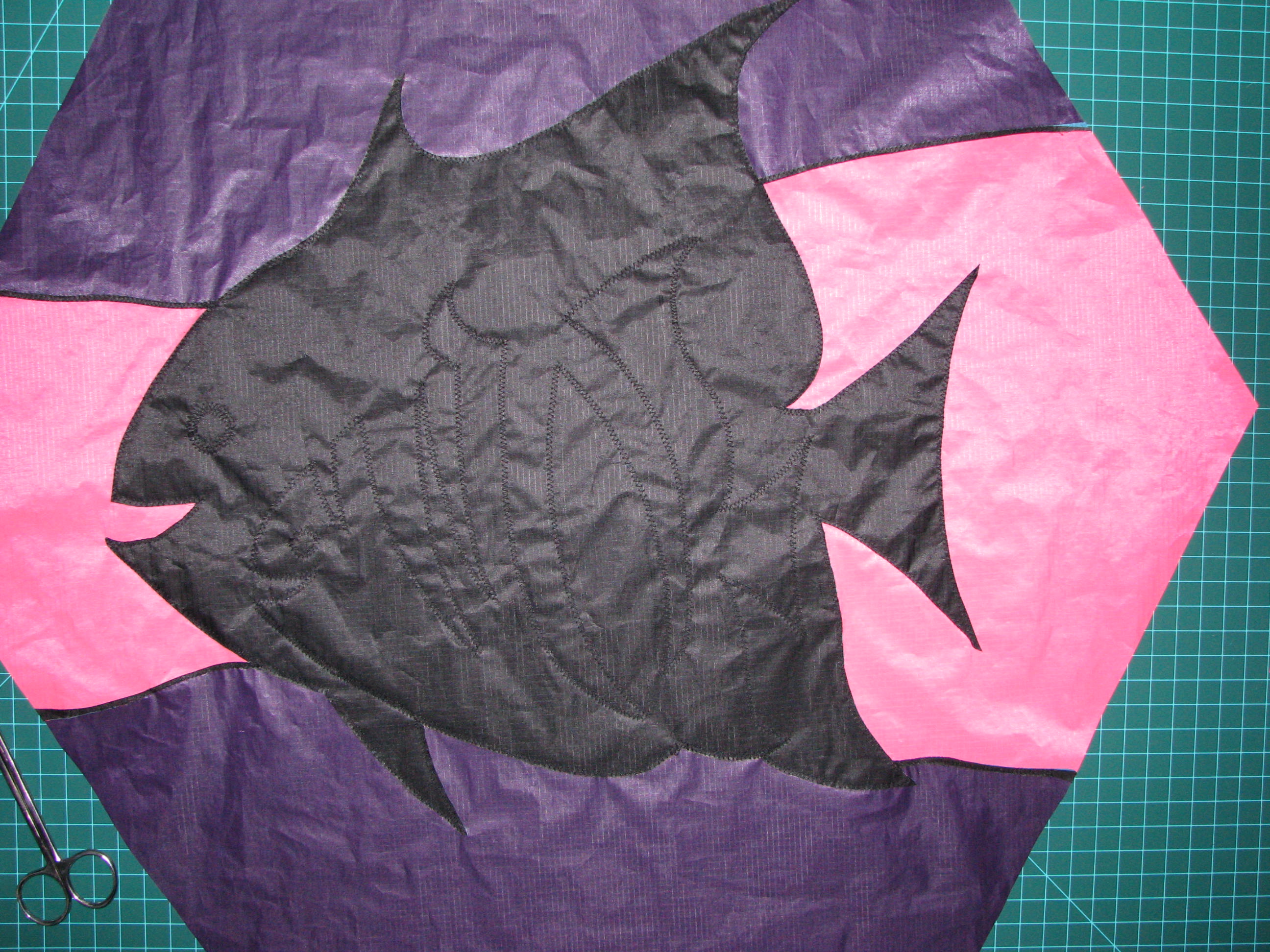 The applique sewing is complete and I am cutting away the unwanted layers of ripstop. Tomorrow I have to get some more thread for hemming and pockets. Then I need to do repair work on some of my kites so they will be ready for the festival. Yes, I have been procrastinating. I hate repair work. Mostly it’s ripping out pockets and replacing them.