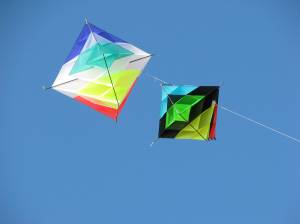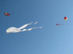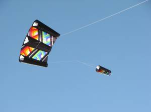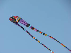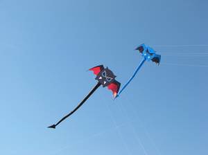The rest of the sky had color from several of our friends kites. Including one unconventional training of a Sky Flake and a Firefly 2. Both of these kites are made at Kites Unlimited in Atlantic Beach, NC. Both will hang in the air like they were pinned there. But they will dance and bob around if you give their lines a tug now and then. Neither of them like to fall to the ground and will rise before hitting the ground when the line is pulled and released. It makes a good show for spectators as they think the kite is falling and it magically rises up again. I’m not sure if they ever had been trained together before but it worked pretty well and they both behaved themselves.