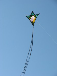 I first put up my twin tail dragon. The last time it flew was about a year ago and the wind was so strong I didn’t get the tails wound up neatly, they were just stuffed in the bag. So my initial job was to untangle and untie the tails. Lesson learned – no matter what, roll up your tails before packing away a dragon kite. Once in the air, it flew beautifully.