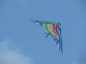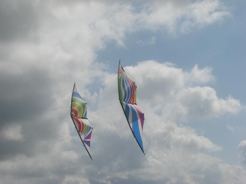 The wind was around 10-12 mph and the temperatures had decreased to a tolerable level.  The sun peeked out from behind the clouds at random intervals.  In other words, a perfect day to fly.  The best word I can think of to describe the flight of my little stack is “SWEET”.  The two kites flew as one with hardly any pull to speak of.  Loops, dives, figure eights, low-level flight and high; it was almost euphoric.  And the rainbow colors stood out against the light gray clouds and the patches of blue sky.  I may never fly those kites singly again.