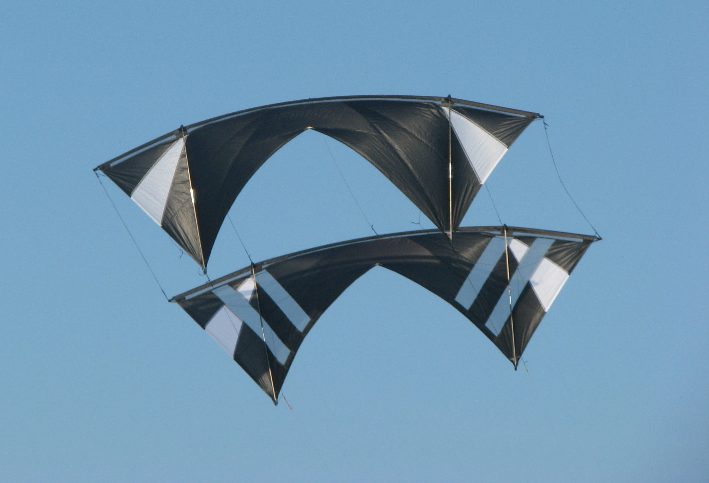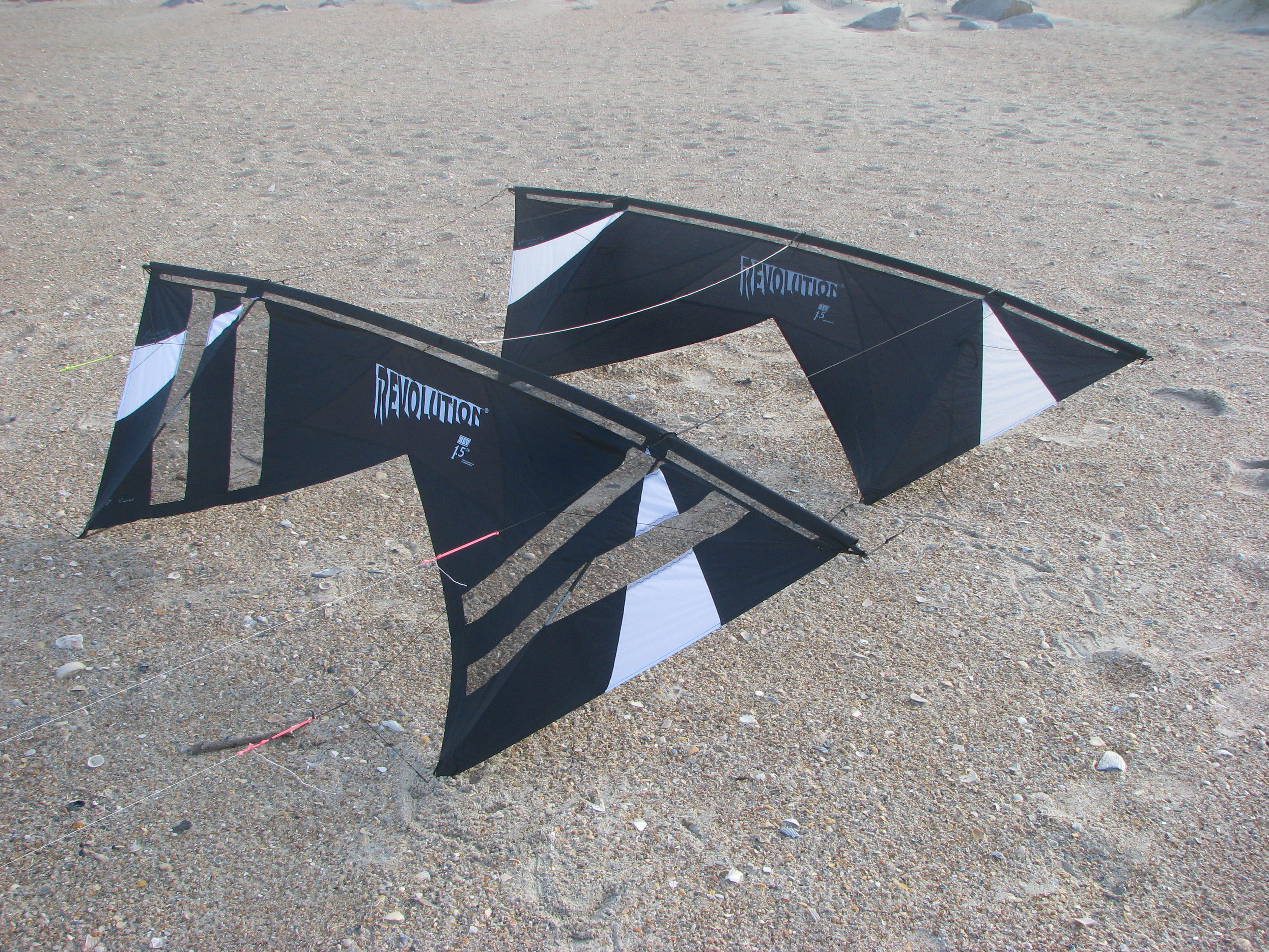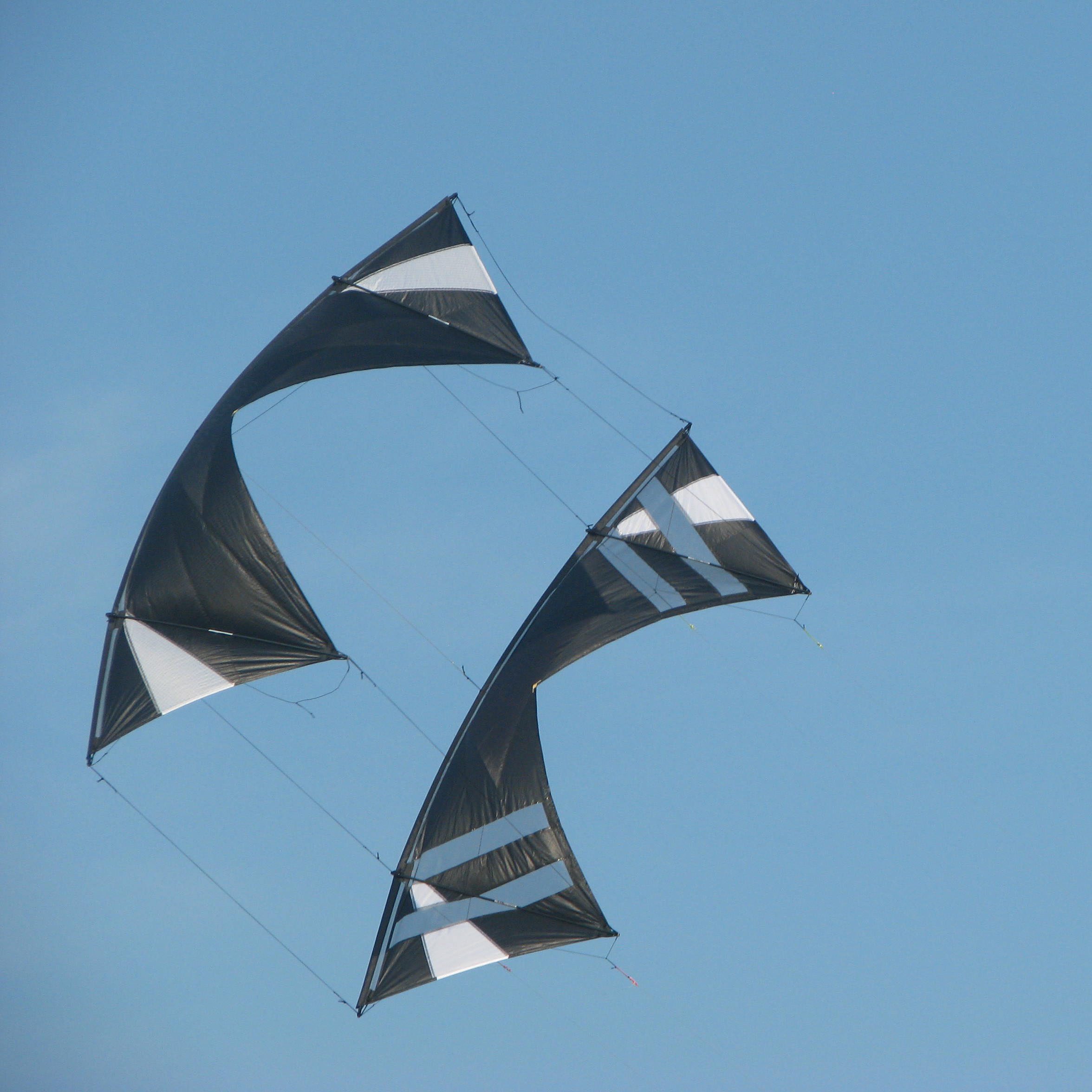 Not being an expert flyer, I decided to start with a small stack. I have two kites that have the same sail pattern, the Kites Unlimited Custom Revolutions. One is a full sail and the other is a vented sail. So I went out one evening when the wind was about 10 mph and the temperature had gone down to something bearable. My mind was picturing tangled lines and ugly crashes. instead I had a wonderful time. The two kites flew as one with just a slight pull on the lines. The only time things got wobbly was close to the ground where the wind got a little light. And, even then, it was controllable. I’m looking forward to taking these out again. And again and again.