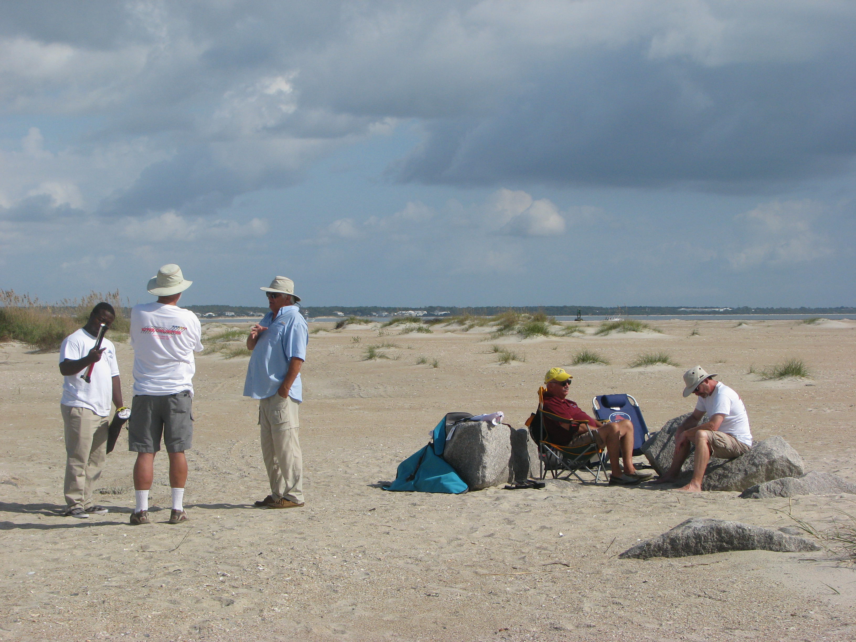 And as usual, we were visited by “The Sunday Curse”. The winds were light as we drove into the parking lot but we were prepared and had brought our light wind kites. We got to the beach and had a few kites up and flying when the curse hit. The wind completely died. The flag above the fort wrapped itself around the pole and all kites drifted slowly to earth. Now what do kite flyers do when the wind stops? They sit around and solve the problems of the world and ponder if they should just pack up and go home or not.