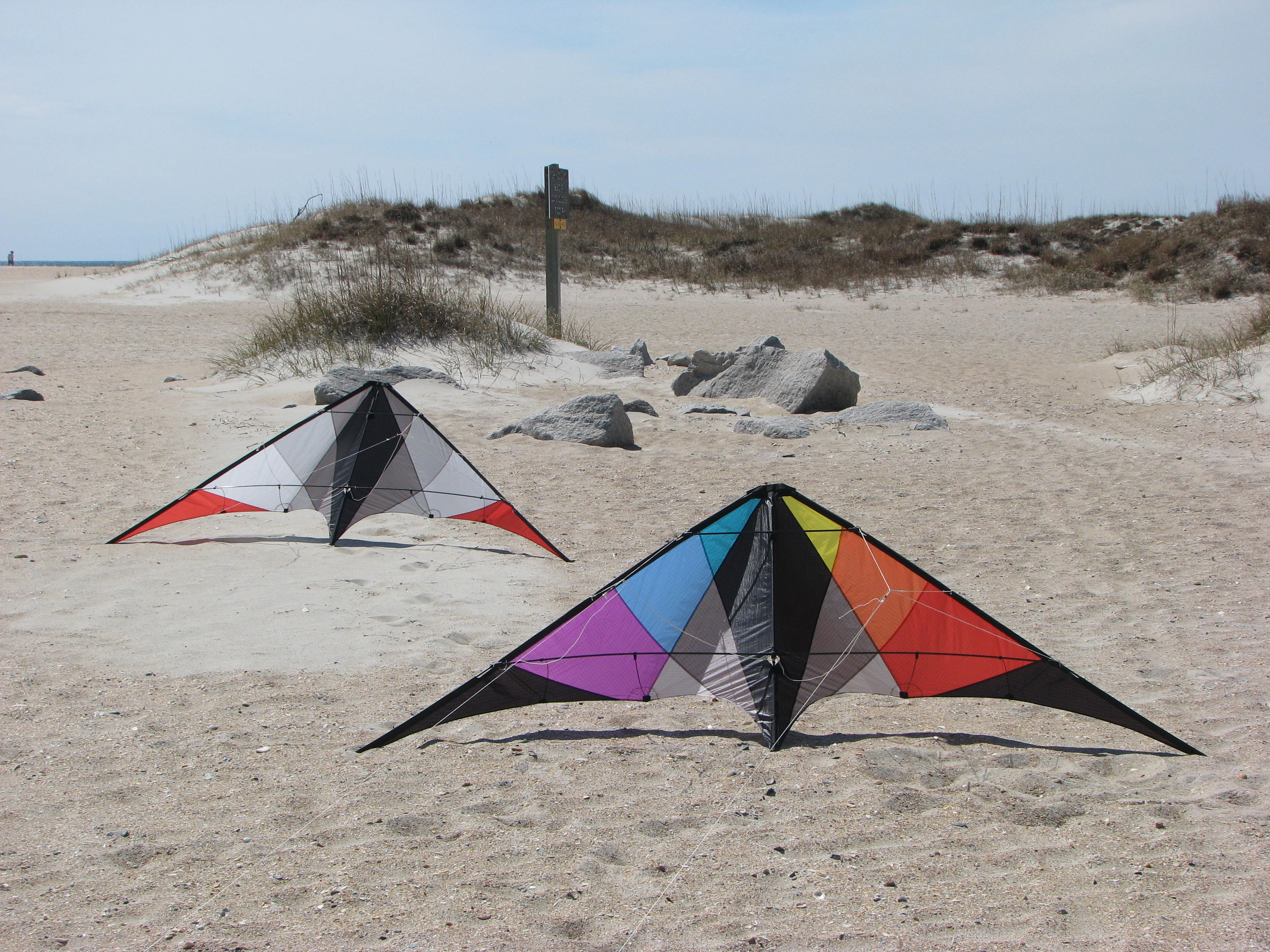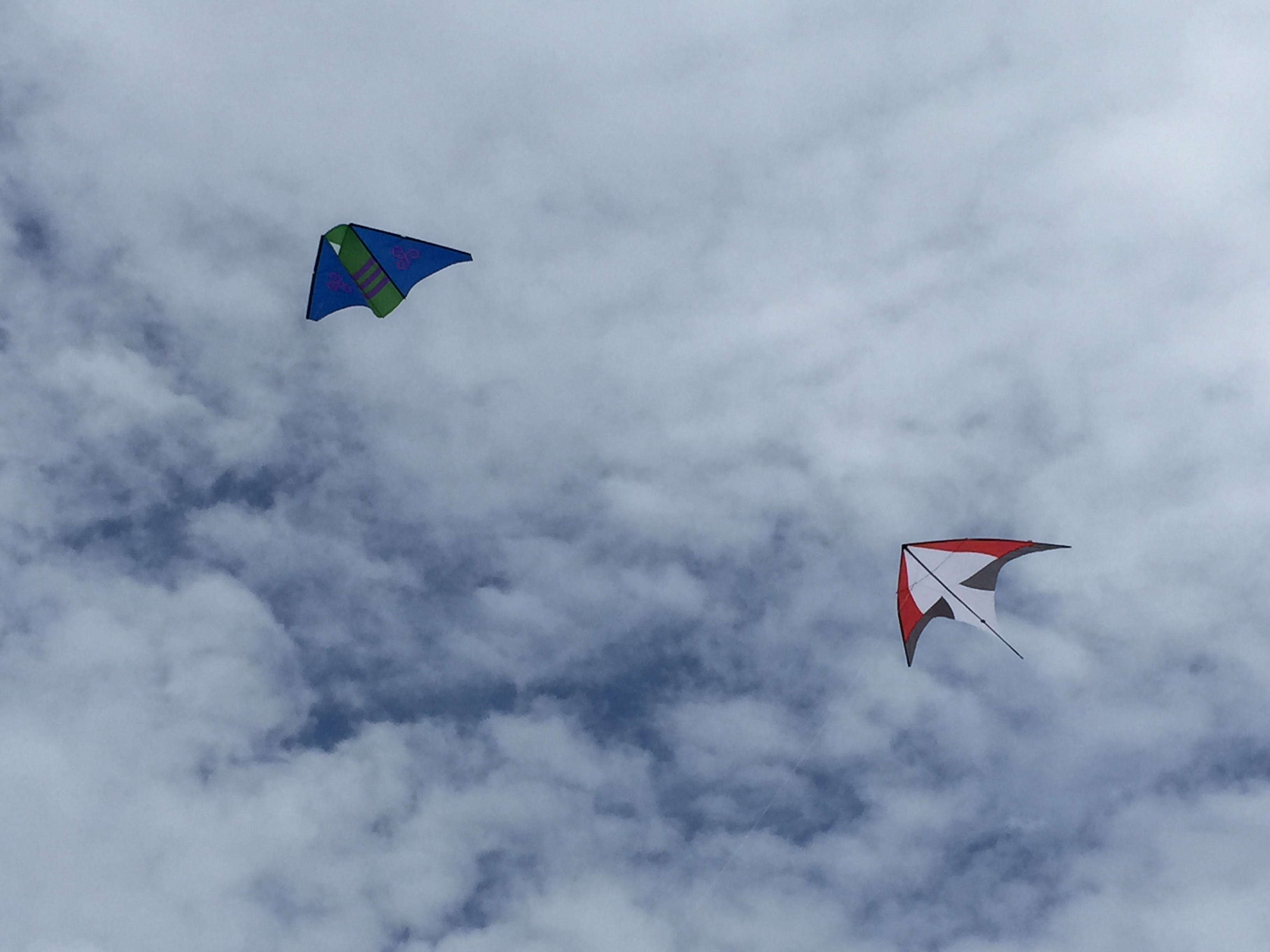 The days in between were beautiful. The temperatures were warm, the sun shone and the winds varied from light to mid-range and perfect for flying. We added two more kites to our vintage bag. Both of them are Skywaves made by David Prentice. The Skywave is an “old school” dual line stunt kite. The day we took them out to fly the wind was on the light side and I wasn’t sure there was enough for this kite. If not, we would have to be content with our low wind single-line kites. Boy, was I wrong. Both flew smooth with hardly any pull. Beautifully responsive and not tricky, just the way I like to fly. So another piece of history landed at our house and we are so pleased.