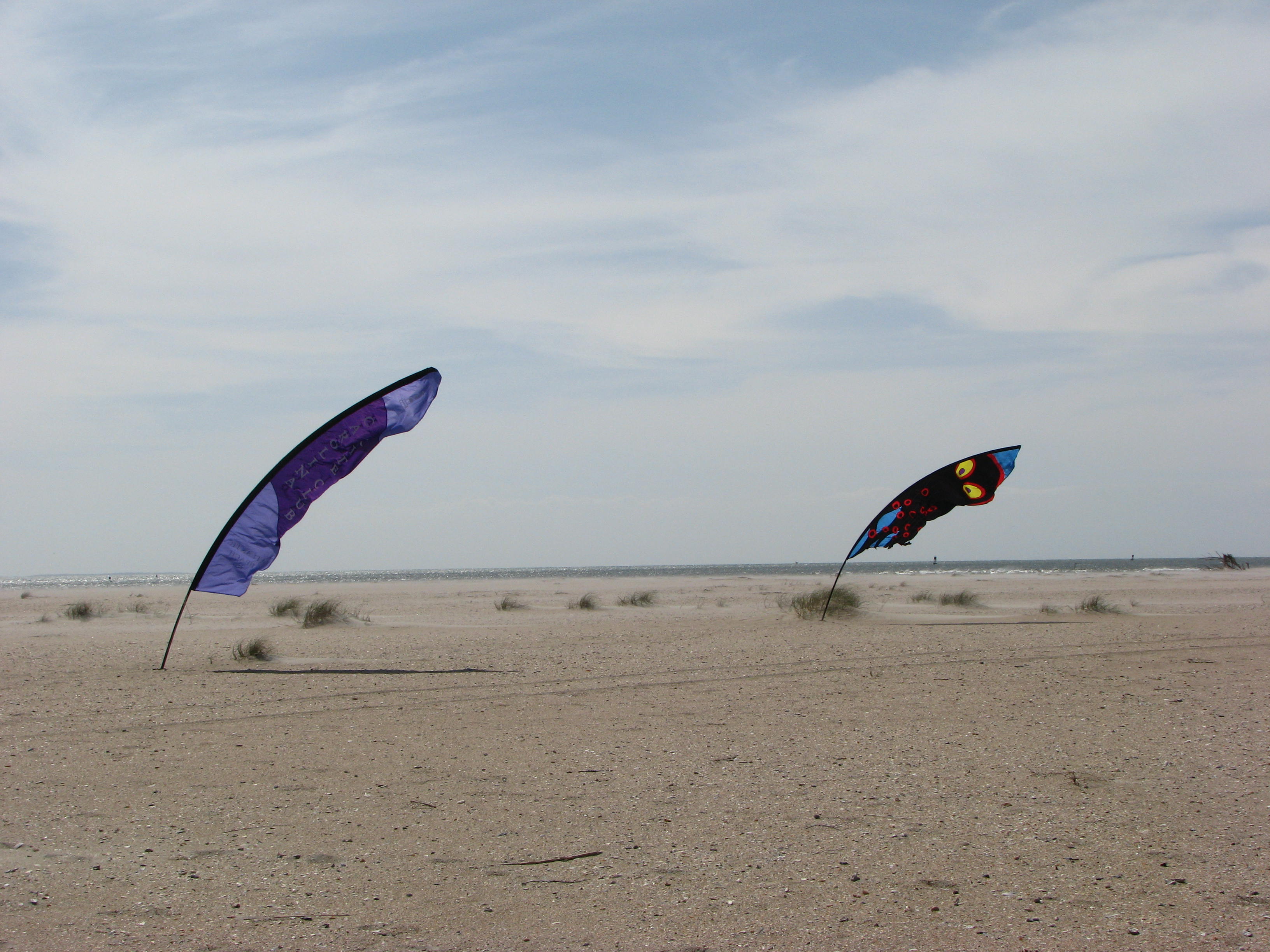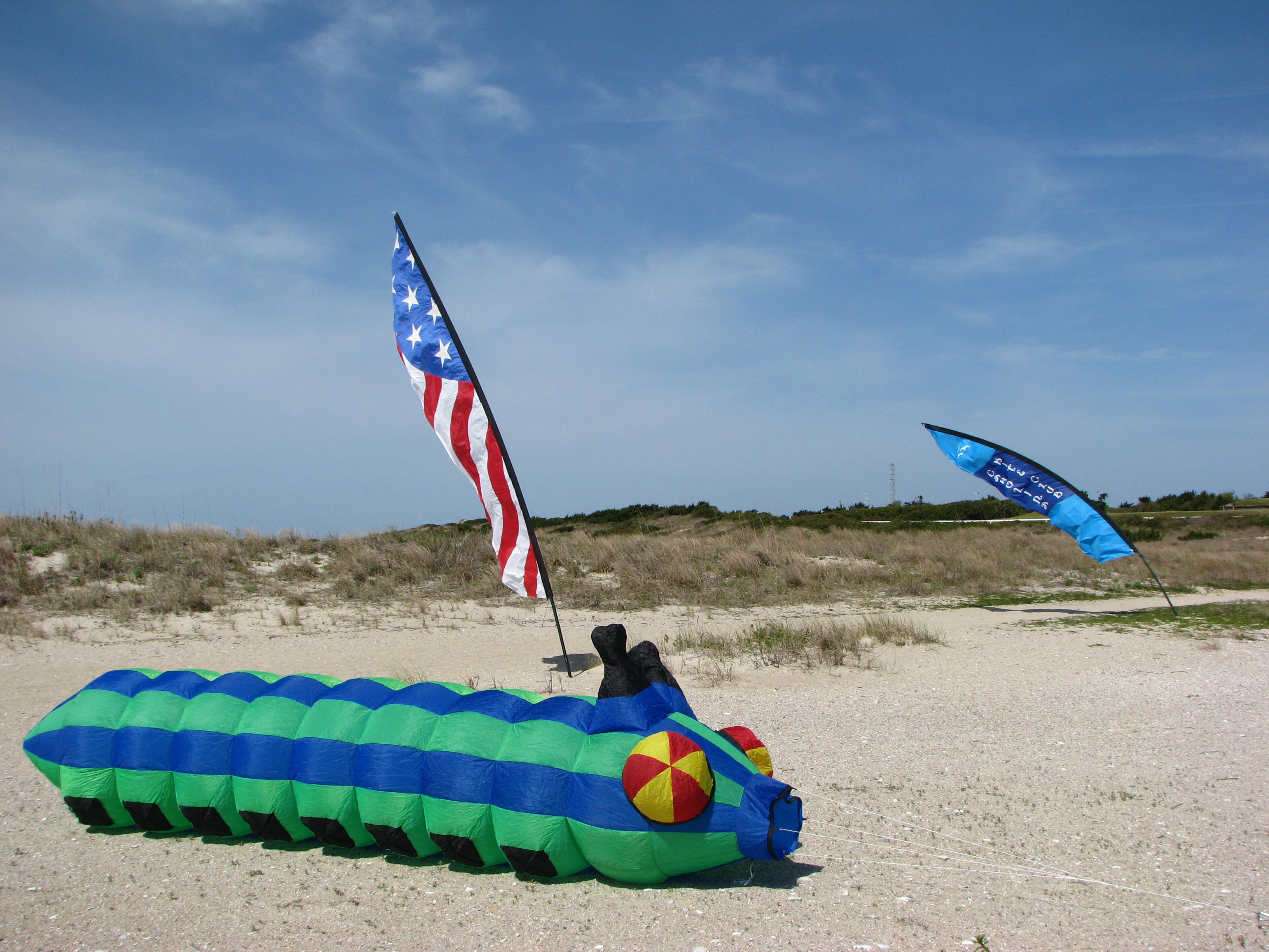 Our first order of business was to put up the banners. After they were up, we began to think this was not such a good idea. Wind gauges were measuring 18 to 22 mph and the sand was beginning to blow across the surface of the beach. One intrepid flyer did launch a large HQ flowform with long tube tails and then immediately went and added extra sand to the anchor. Another put up a mesh delta which handled the wind quite well. I anchored out my large ground bouncer caterpillar. The rest of the group decided it was too much wind but would wait a while and see if anything changed.