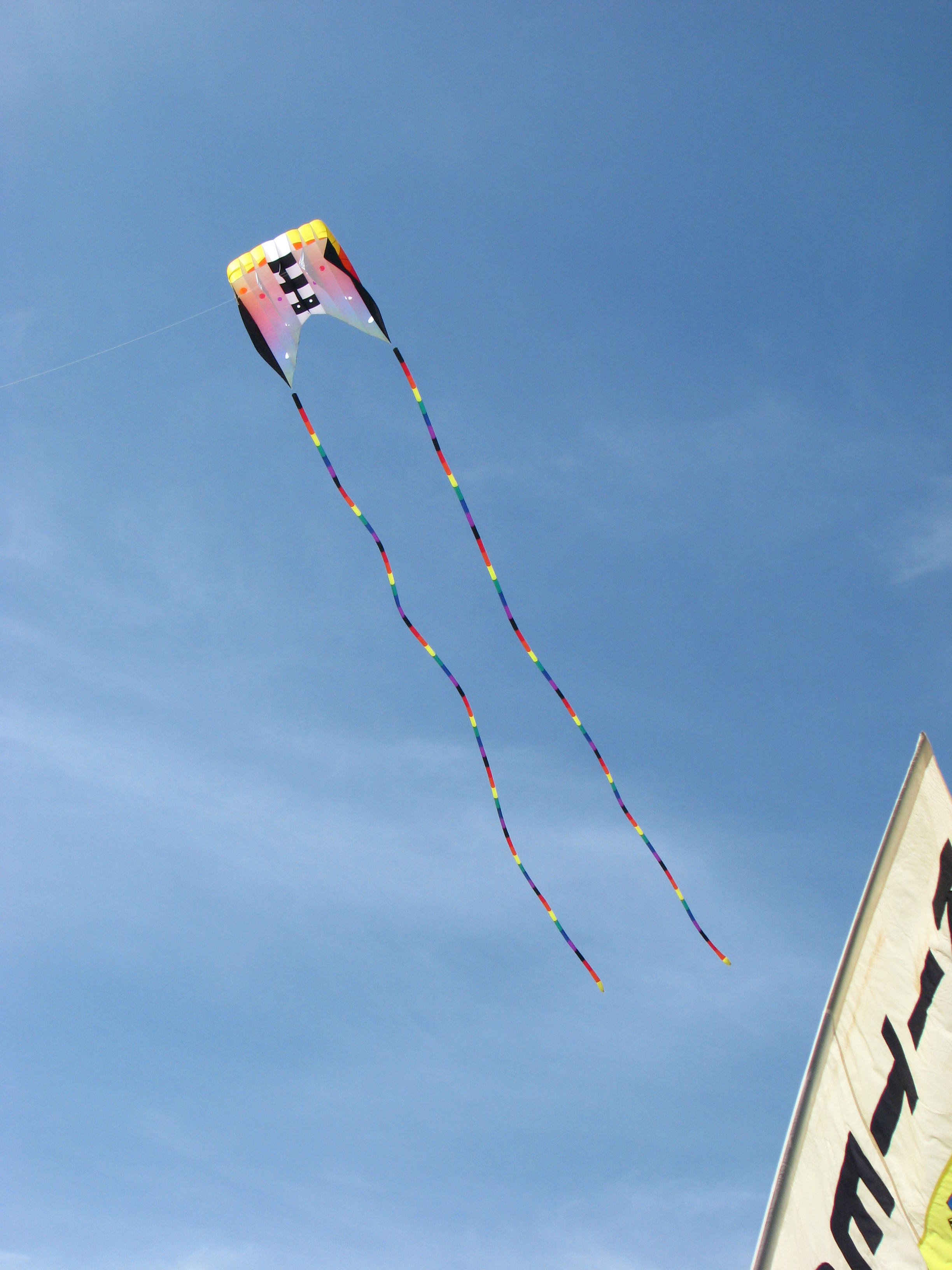 The days prior to this event were sunny, warm and blustery. That is to say the winds were ranging from 14 to 20 mph. We were all hoping those strong winds would calm enough so we could fill the sky with large kites and long tails. Temperatures dropped a little on the day of the fly but the winds did not. Ever the hopeful group, we took the kites we planned on flying and went down to the beach.