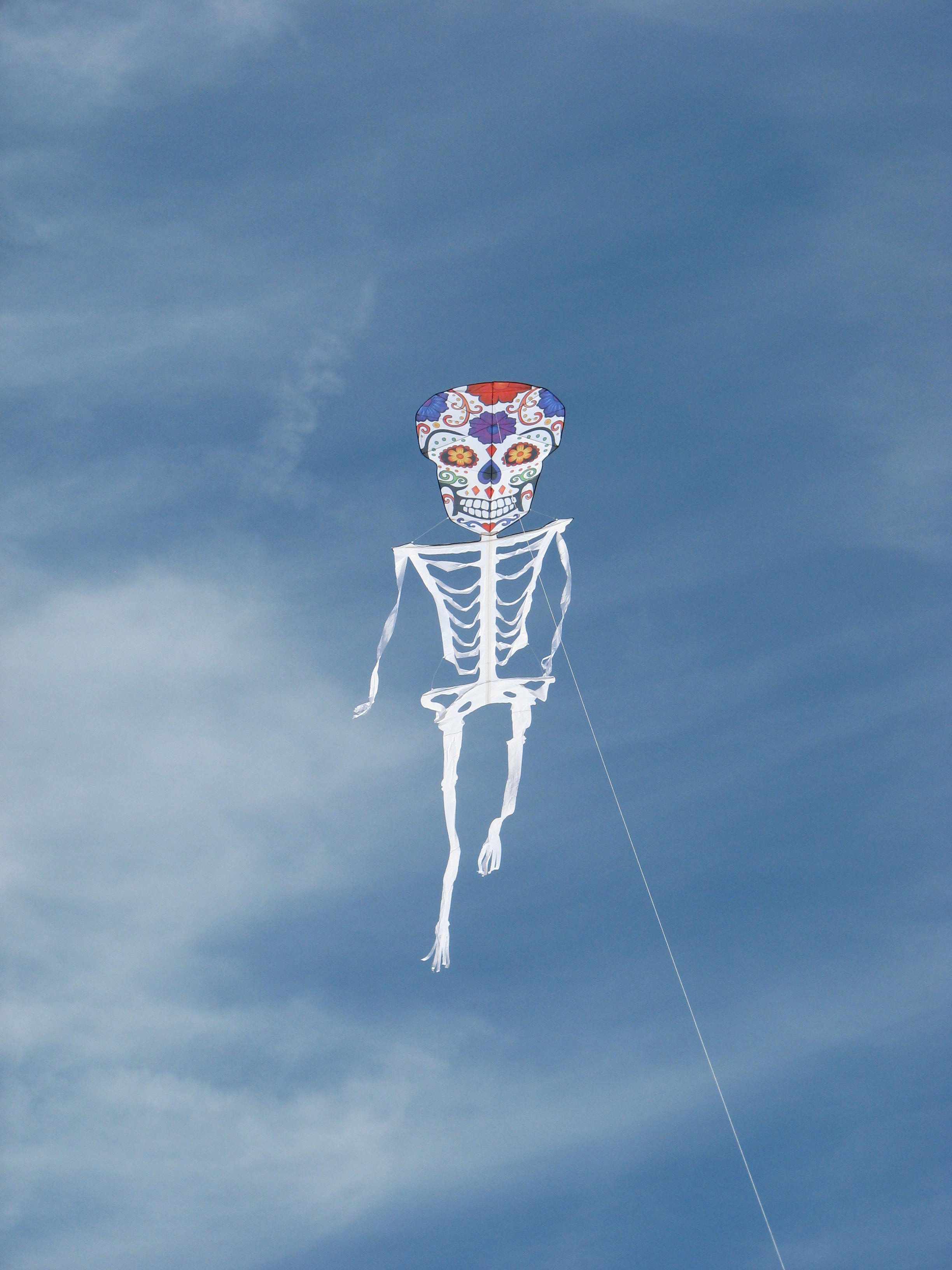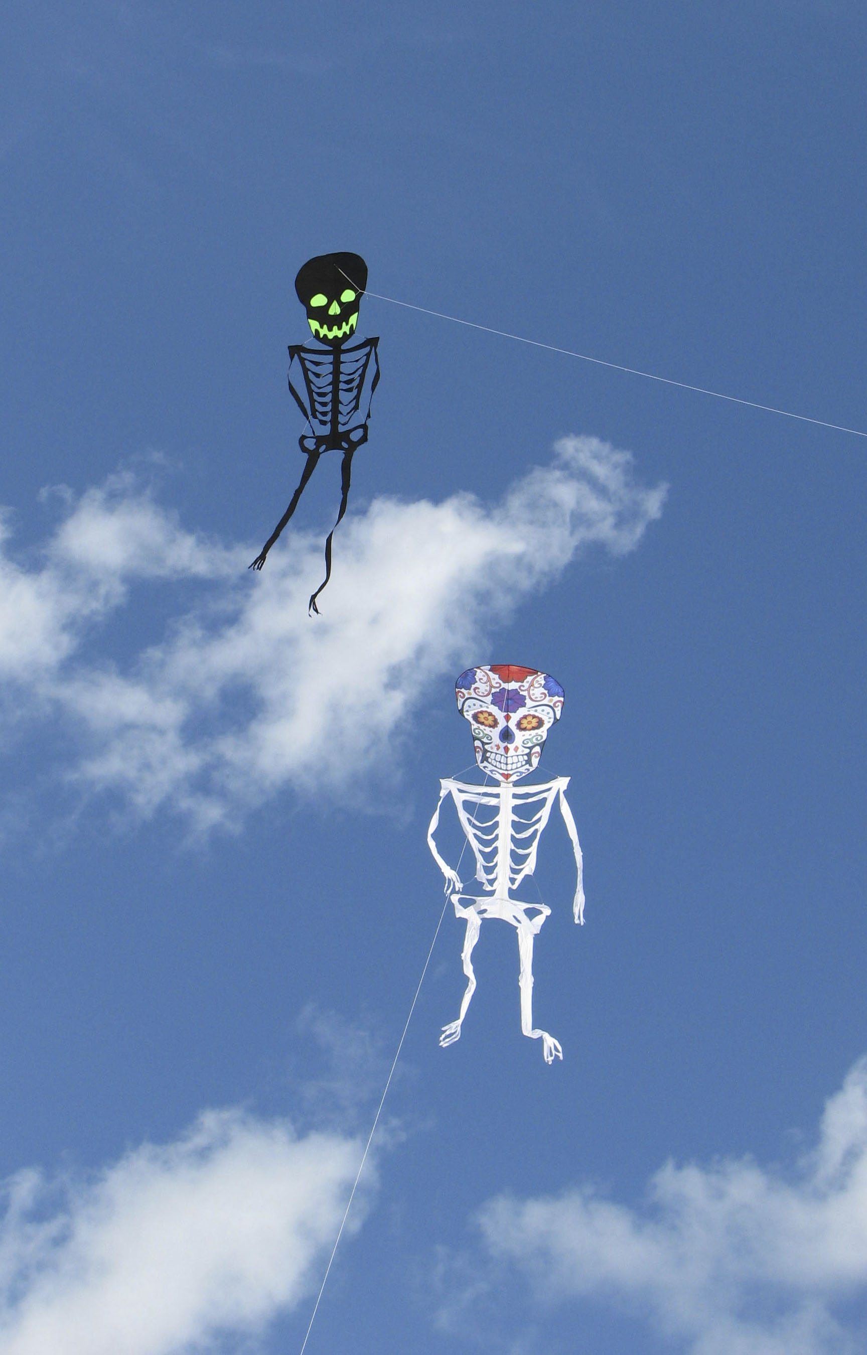 Don Dixon of Kites Unlimited just happened to bring along the black skeleton in the smaller size. It took a little maneuvering but we got both skeletons to fly next to one another without tangling. They looked pretty good together.