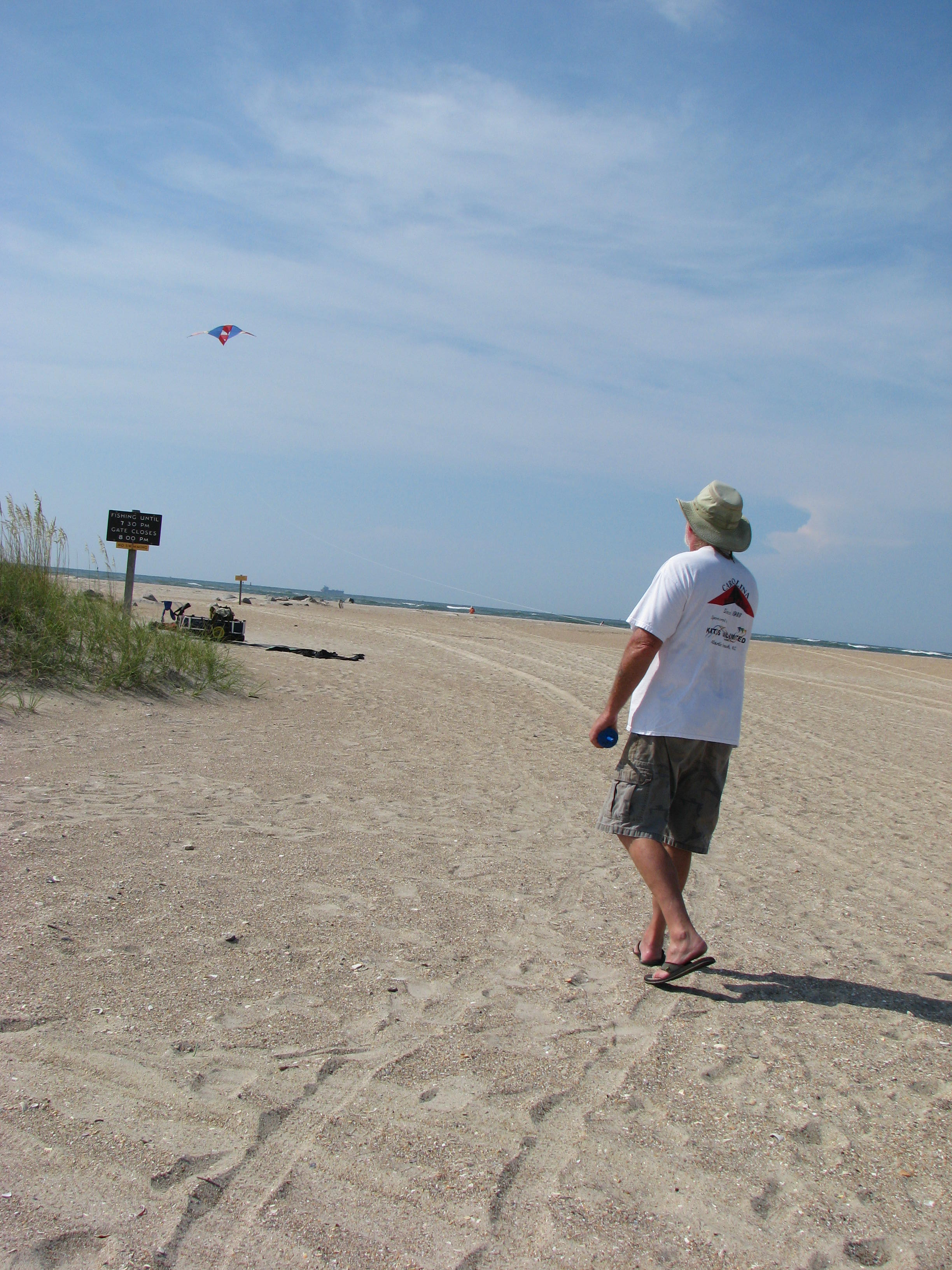 The lack of wind made the heat even hotter. What we should have done was leave the beach and return to the air conditioning. That was the easy way out and not for us this day. The small hardcore group went down to the beach and nursed our low-wind kites into the sky.