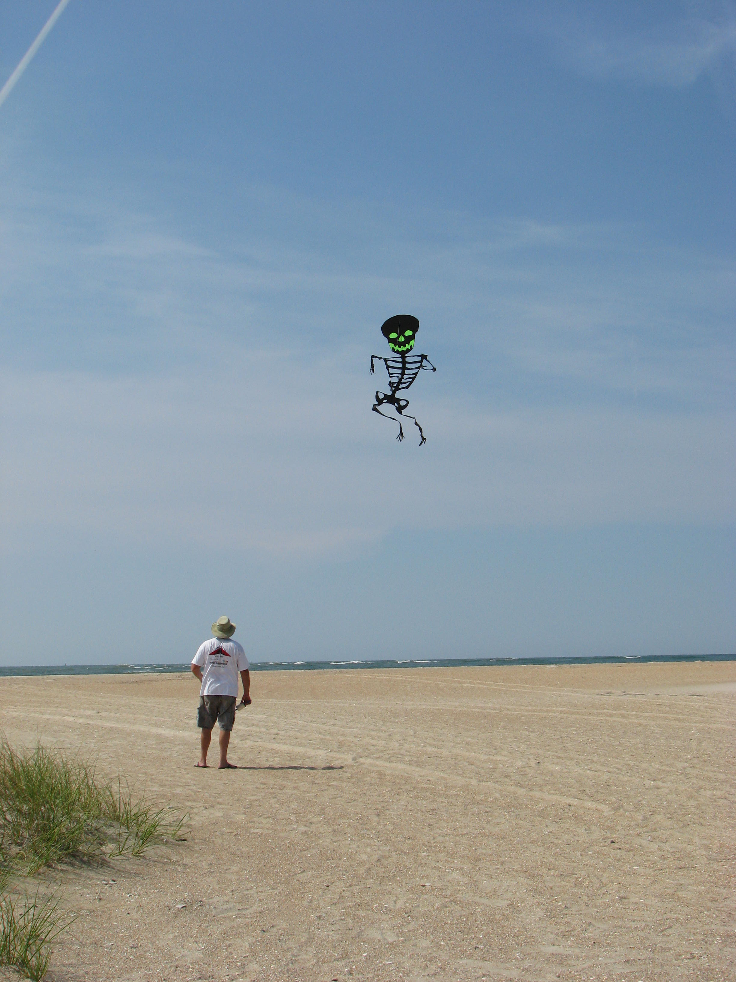 Just for fun, one of our club members tried to fly the new Skeleton kite. After all, the box Delta flew so maybe there was a large enough sail to get that kite in the sky. Unfortunately, it was a no go. But it was fun to watch as it danced crazily before settling to the ground.