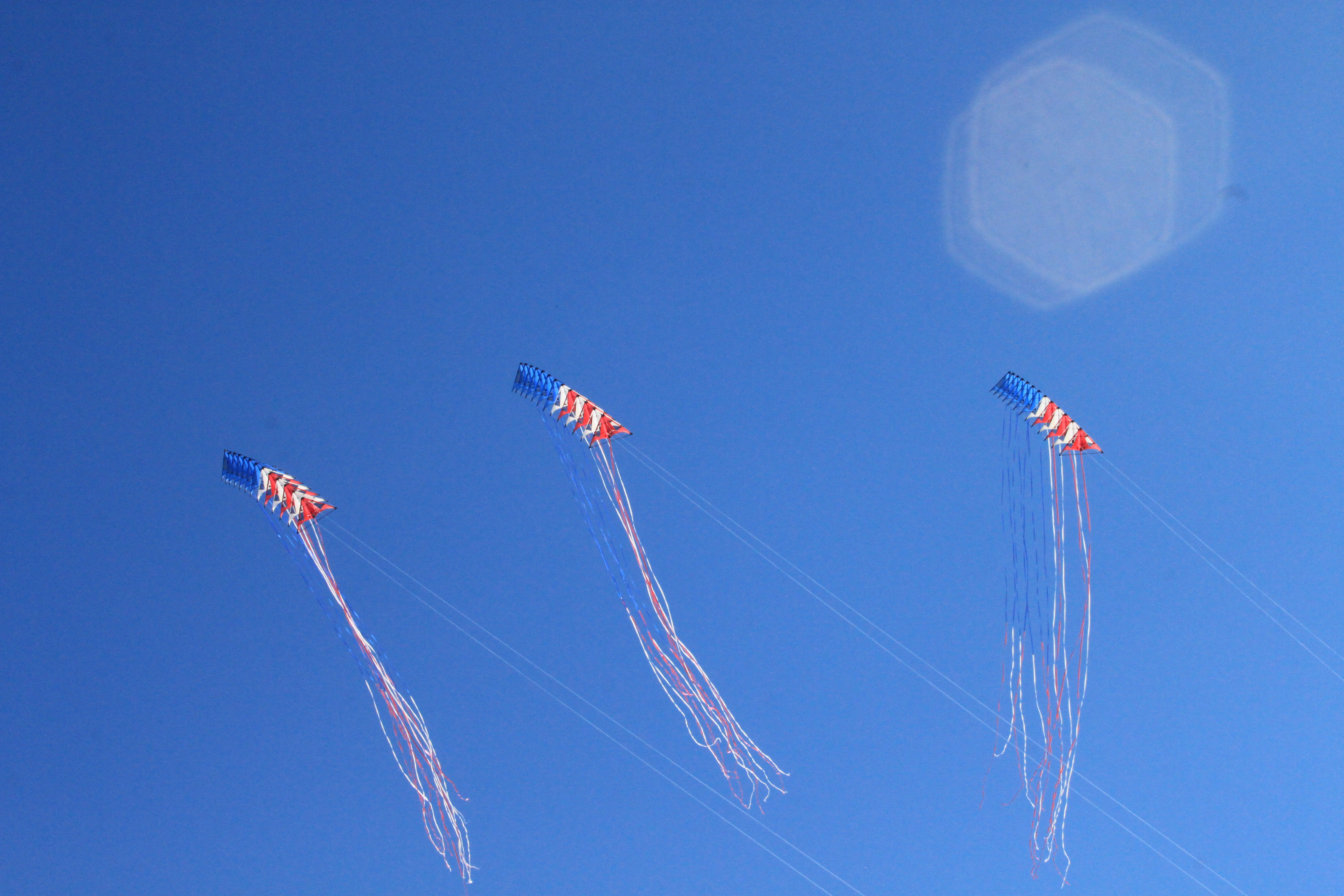 The Bay Area Sundowners Kite Team came from San Fransisco to perform both days. They are always a joy to watch. They perform routines flying stacks of thirteen hyperkites in red, white and blue. Many spectators come year after year to see them perform. Saturday’s wind was a little too high but they gave it a try anyway and did a good job. The slighter winds on Sunday were better and the team flew a couple different routines throughout the day.